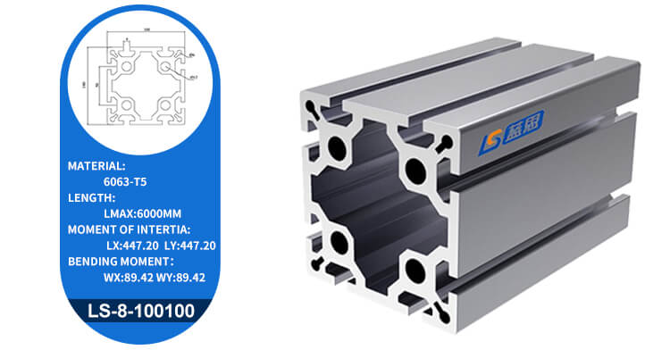 Промышленные алюминиевые профили серии 100 представляют собой каркасные материалы крупного сечения, выдерживающие высокие нагрузки, размер профиля 100×100 мм, размер паза 10 мм, могут использоваться для сборки каркаса с высокими требованиями к несущей способности, но из-за большого веса профиля, цена алюминиевых профилей также выше, чем у материалов других характеристик.
